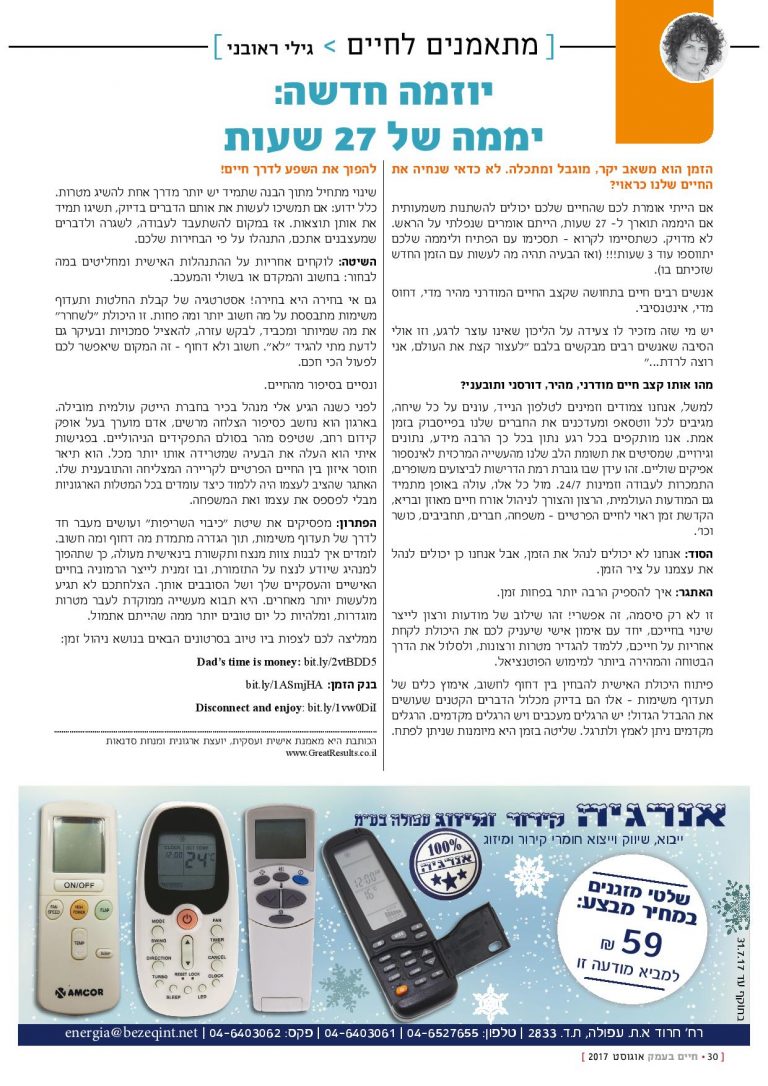 המאמר התפרסם במגזין היוקרתי "חיים בעמק" בתאריך 13.7.17 מה דעתכם על הצעה מהפכנית? להפסיק להתעסק ולהתמקד בכישלונות שלכם, לשחרר משקל יתר וסטיגמות. להמריא. למהלך